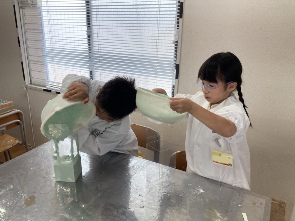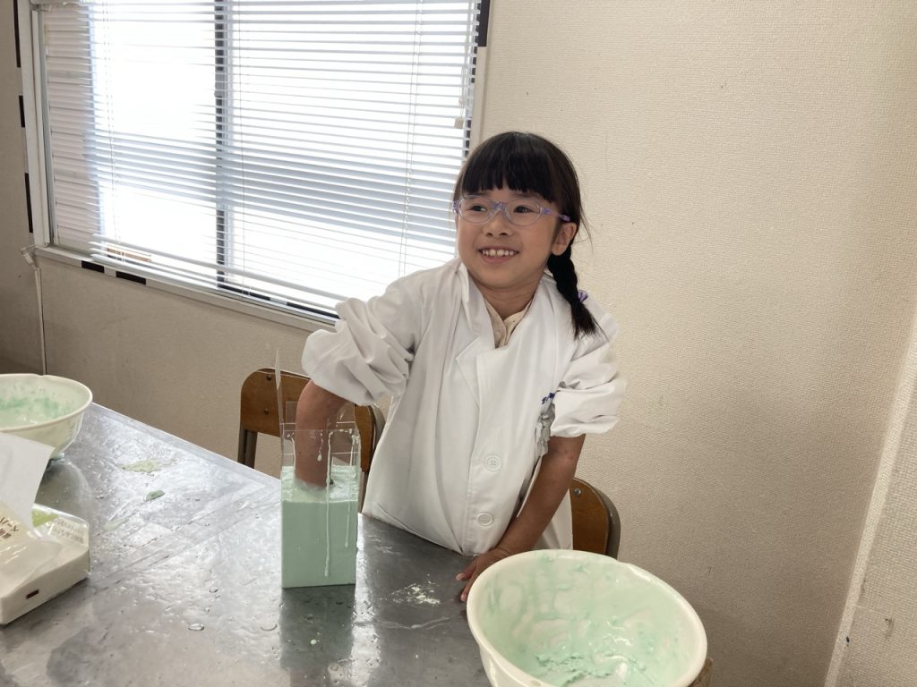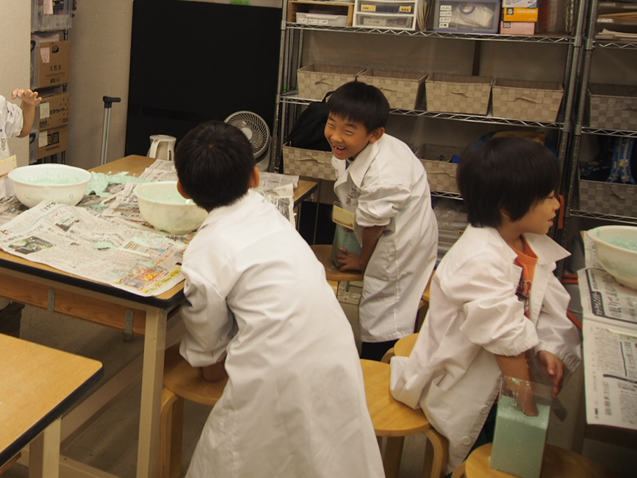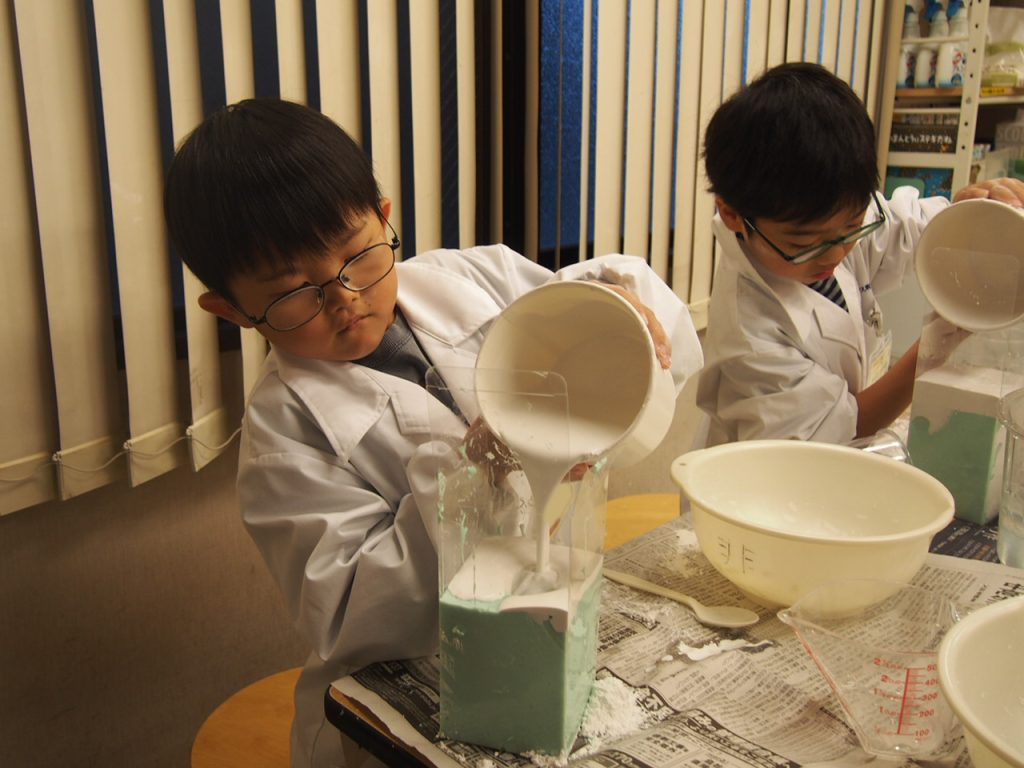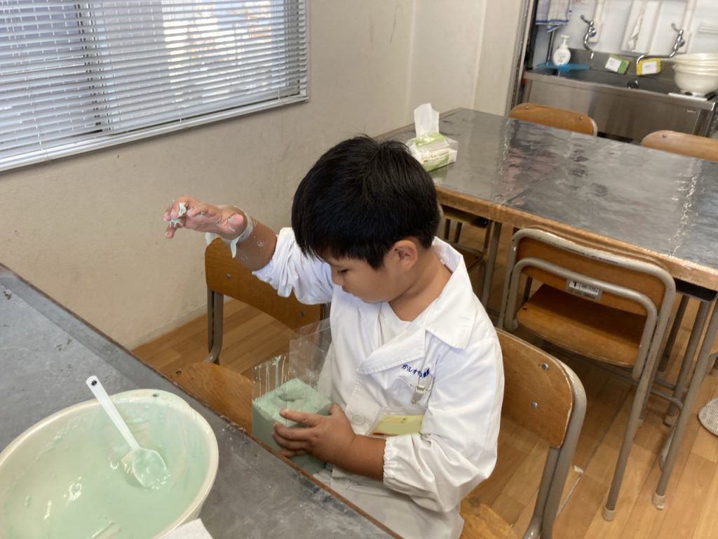 型が作れたら、そこへ石膏を流し込んでいきます。石膏や水をはかる、まぜる、流し込む。先ほどの型取り材とは違う感覚を楽しんでいました。