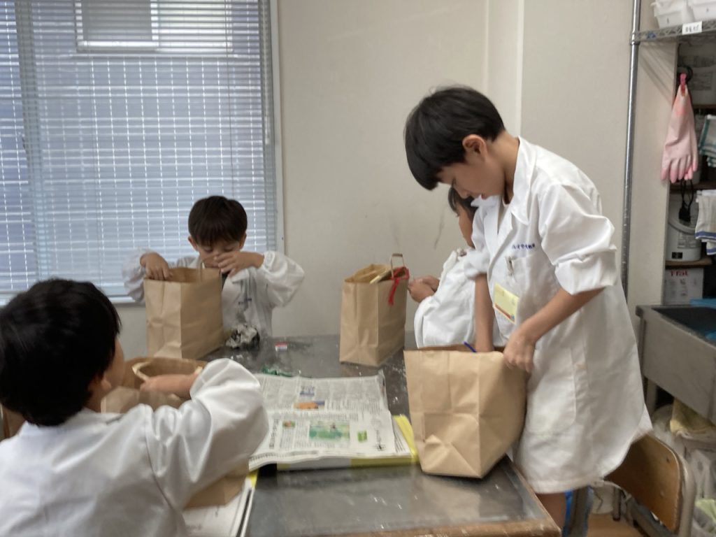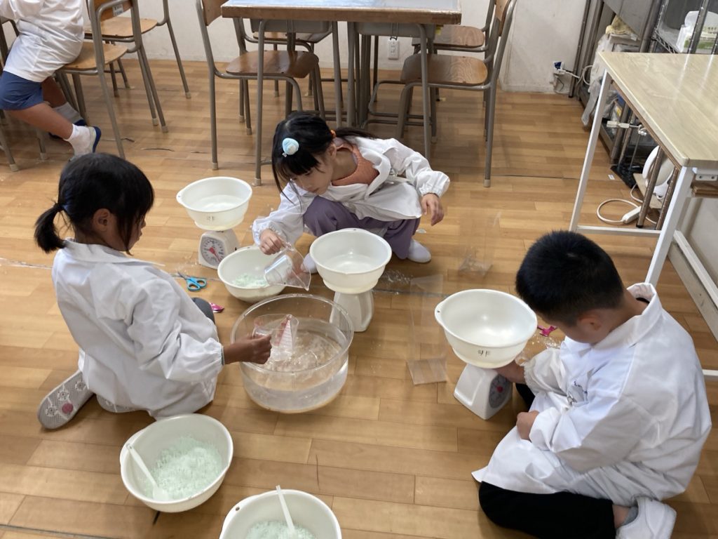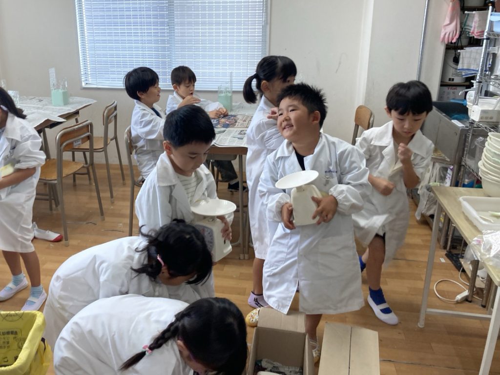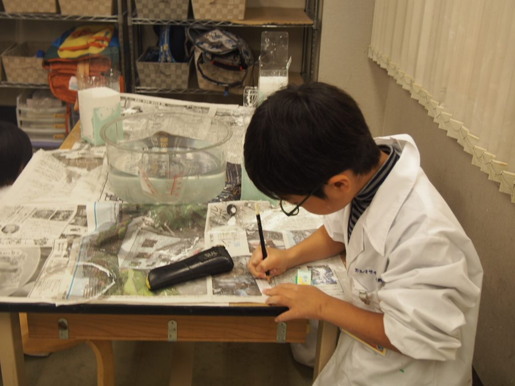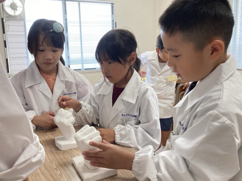型が作れたら、そこへ石膏を流し込んでいきます。石膏や水をはかる、まぜる、流し込む。先ほどの型取り材とは違う感覚を楽しんでいました。