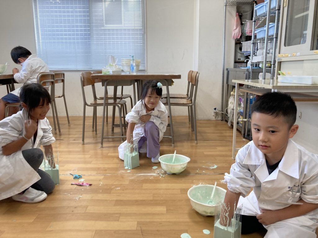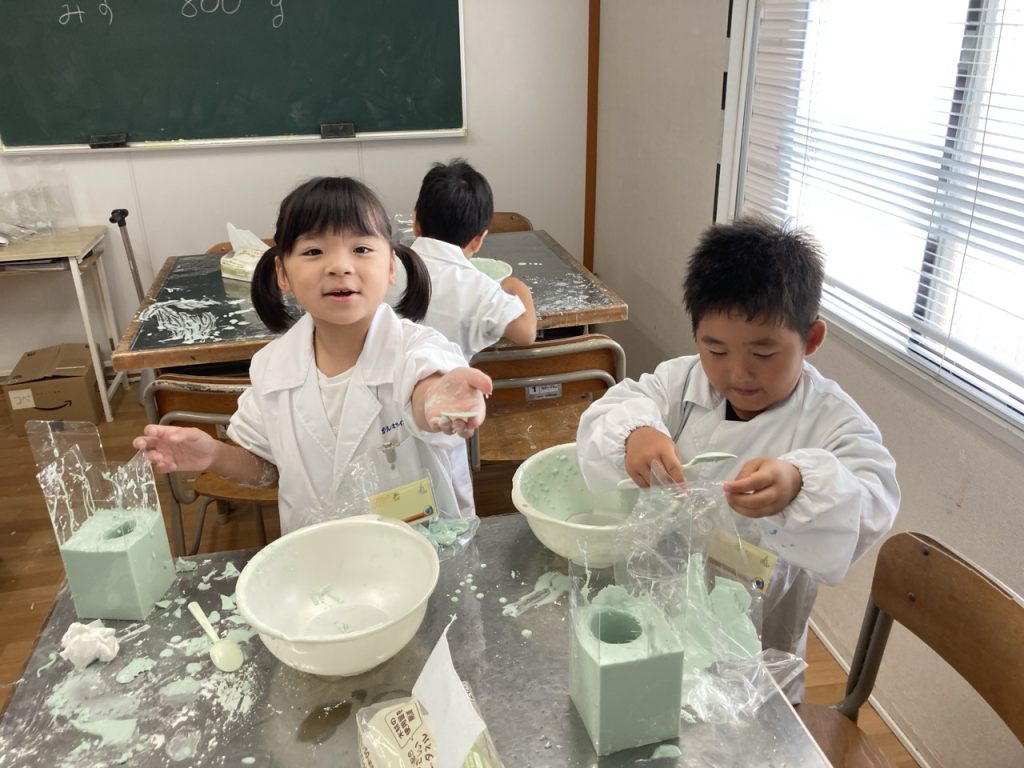 台はかりや計量カップを使って型取り材や水をはかりとる、それらをまぜる、プラスチックケースに流し込む、手を突っ込む、しばらくじっと待ちます。すべてお子さんが進めていきます。台はかりにいろんなものを置いてみたりすることも止めたりはしません。その好奇心、興味関心を大事にされることが、お子さんがこれからの人生を楽しめる状態になるかに関わっていると思います。