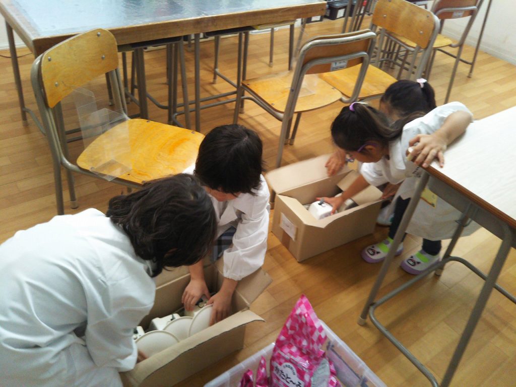 かたまった石膏を型からはずす作業は、実験室ではせず型ごと持って帰ってもらいました。