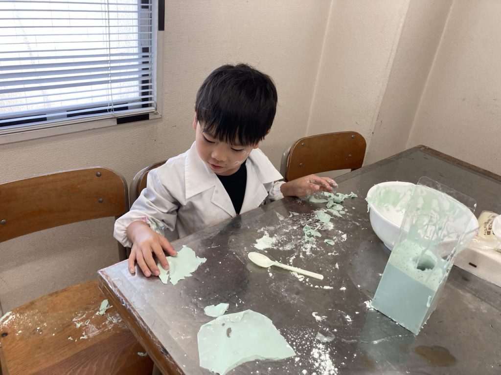 手が抜けて、ホッとしたら、ボウルの中でかたまった型取り材や机の上にこぼれてかたまった型取り材をみつけて、触りはじめます。「ホットケーキできた!!」「スプーンの型がとれたー」「まんまるー」「ひんやりー、気持ちいい」「みてみてー、ちぎれたー」と楽しそうでした。お子さんの好奇心いっぱいの姿にうれしく思います。