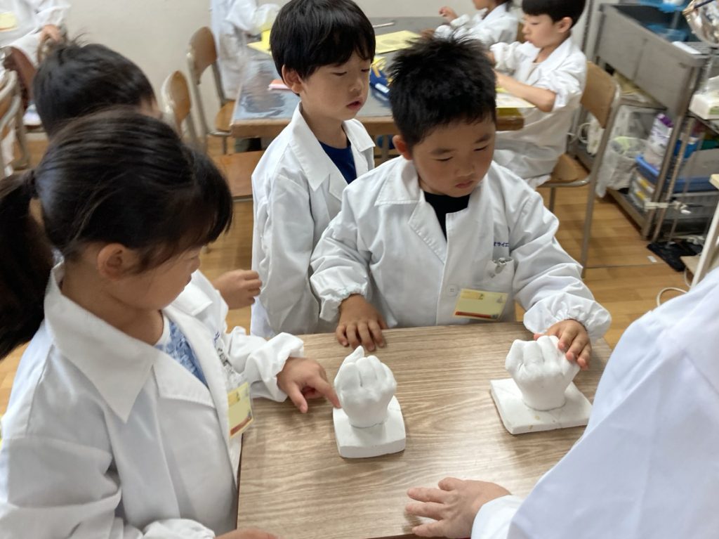 「えっ……、ぬけない……」「むりー」「うわ、ぬけた!!」、ちょっとあせりや不安を感じながら、手が抜けると、自分の手の型をじっと見つめていました。この瞬間にもさまざまな感情を感じます。