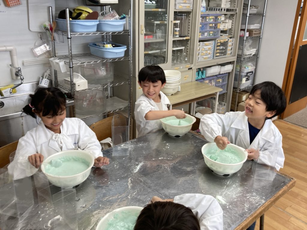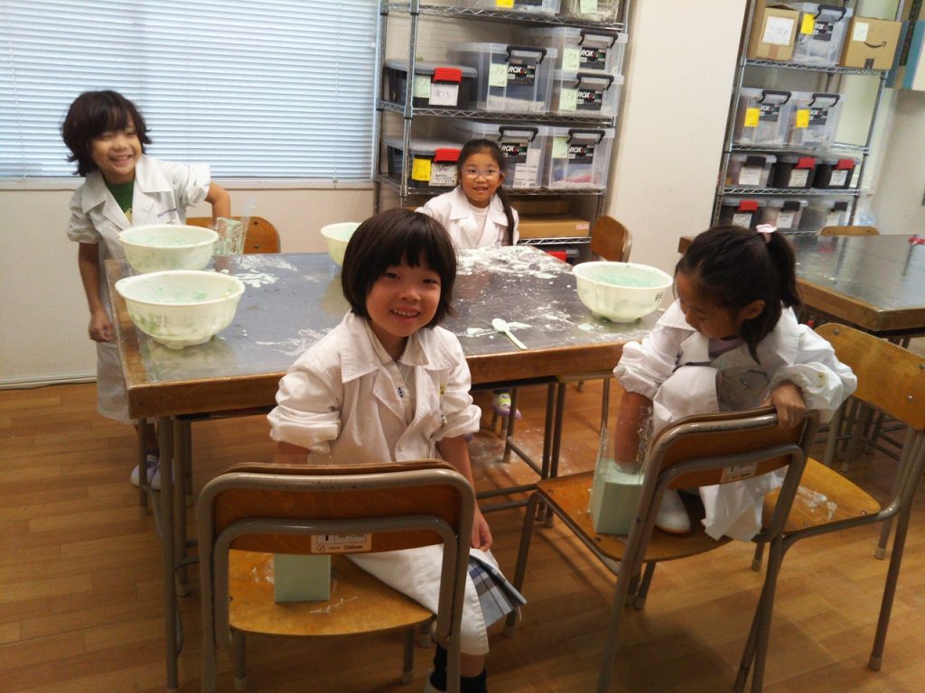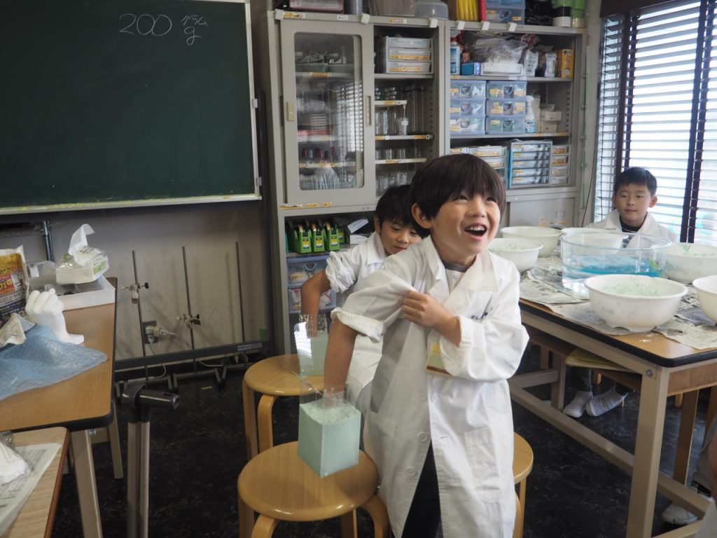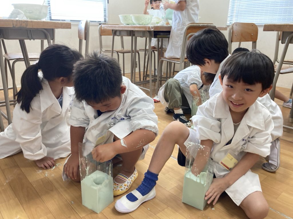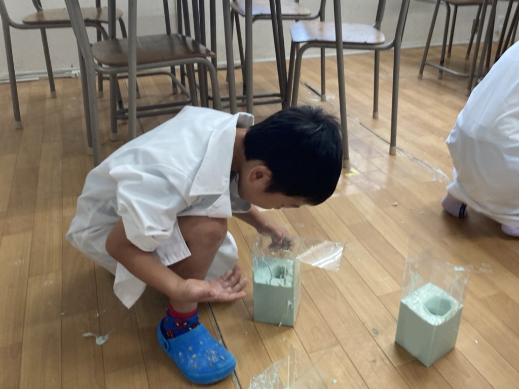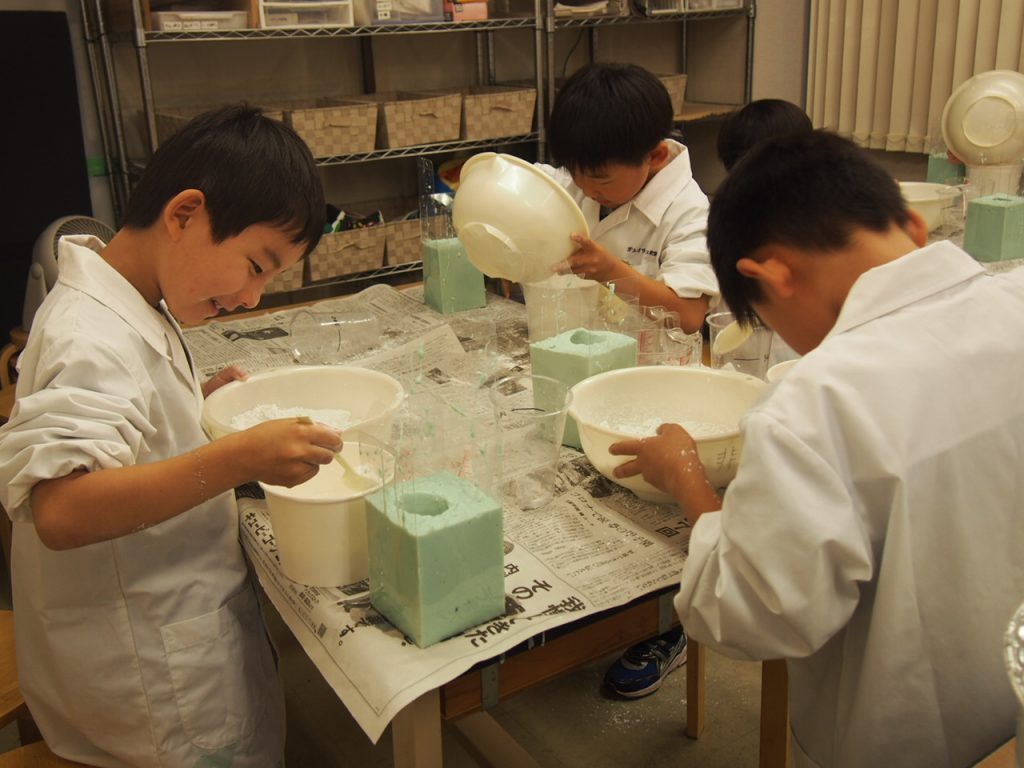 型が作れたら、そこへ石膏を流し込んでいきます。石膏や水をはかる、まぜる、流し込む。先ほどの型取り材とは違う感覚を楽しんでいました。