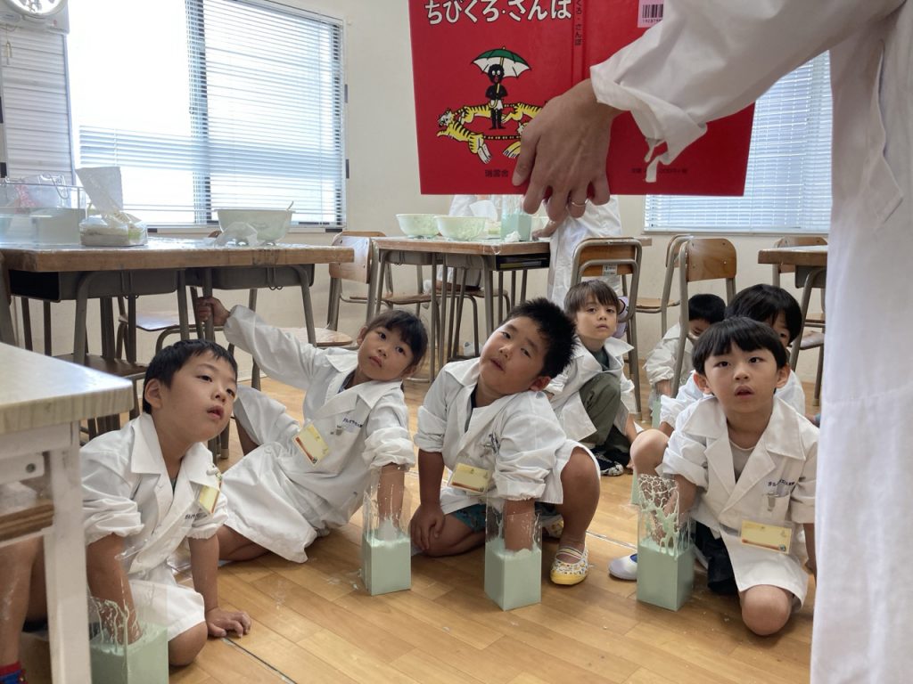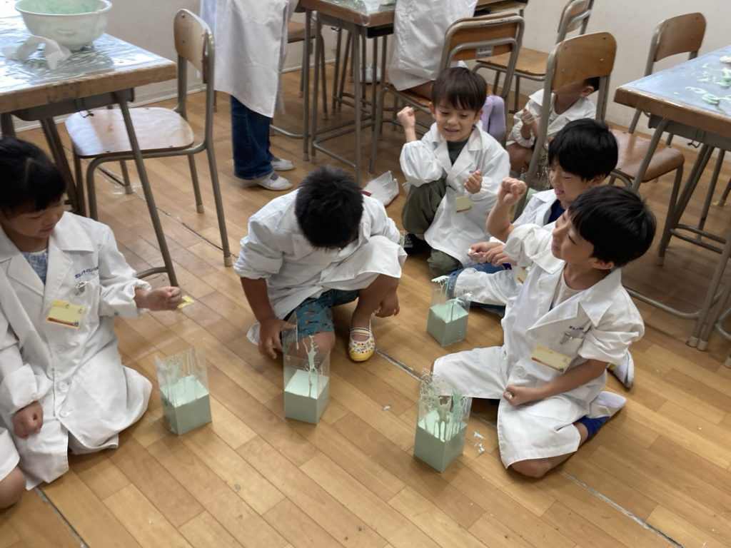 台はかりや計量カップを使って型取り材や水をはかりとる、それらをまぜる、プラスチックケースに流し込む、手を突っ込む、しばらくじっと待ちます。すべてお子さんが進めていきます。台はかりにいろんなものを置いてみたりすることも止めたりはしません。その好奇心、興味関心を大事にされることが、お子さんがこれからの人生を楽しめる状態になるかに関わっていると思います。