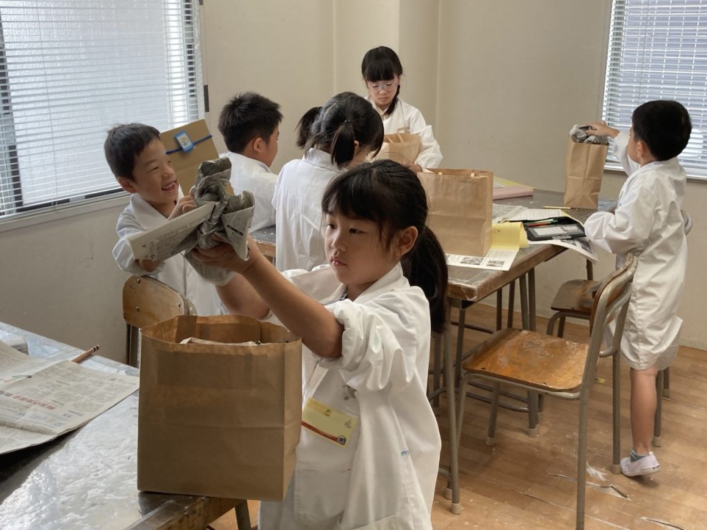 かたまった石膏を型からはずす作業は、実験室ではせず型ごと持って帰ってもらいました。